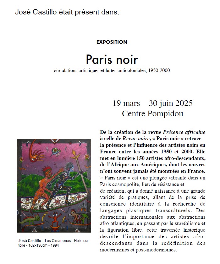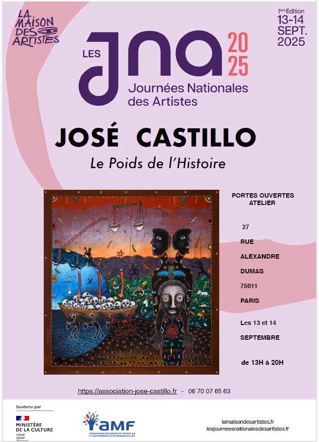 Afirmar que la obra de José Castillo es cautivante, suena a una apreciación general y a nuestra reacción cuando su pintura se nos reveló. Sucedió muy recientemente. Sabíamos de José Castillo, viviendo y trabajando en París, de su talento a la vez caribeño y universal, de esa simbiosis de identidad criolla y formación superior. Sin embargo, nos había faltado la oportunidad de conocer directamente su iconografía . La primera mirada a su trabajo nos procuró una sensación global, de frescor, de humor, de poesía, y al mismo tiempo de una definición enérgica, creando su propio mundo., comunicando una fruición singular. Si adrede José Castillo subvierte los cánones académicos, aparentemente, vemos y leemos una constante preocupación por el espacio, el despliegue compositivo, la perspectiva comprimida o no… Miramos y admiramos la solidez y la precisión de su dibujo, que el color, contrastado y luminoso, no esconde sino subraya, con el esmero de la ejecución al óleo siempre, instrumentando una figuración fantástica. No es surrealismo: José Castillo nos propone su discurso propio, su realidad que aúna visión mítica y mística, paisajes y retratos interiores, fusión étnica e histórica. Escenas y escenarios sobrepasan la vida cotidiana sin olvidarla, desde los personajes a menudo hagiográficos y quiméricos, hasta el medio circundante, vital, poblado, fabuloso. Estas fábulas visuales son lúdicas -invitando a la sonrisa-, y serias – reivindicando los orígenes y el mestizaje dominicanos-. Consideramos particularmente interesante, en varios cuadros, la profusión de criaturas humanas, animales, vegetales, aparte de los protagonistas principales, lo que prolonga la contemplación, la reflexión, la interpretación, si queremos superar el placer instantáneo y el “encantamiento”. Así, finalizamos un texto, breve por necesidad, y anhelamos que los visitantes descubran – como nosotros – la fuerza y la originalidad de la pintura de José Castillo.